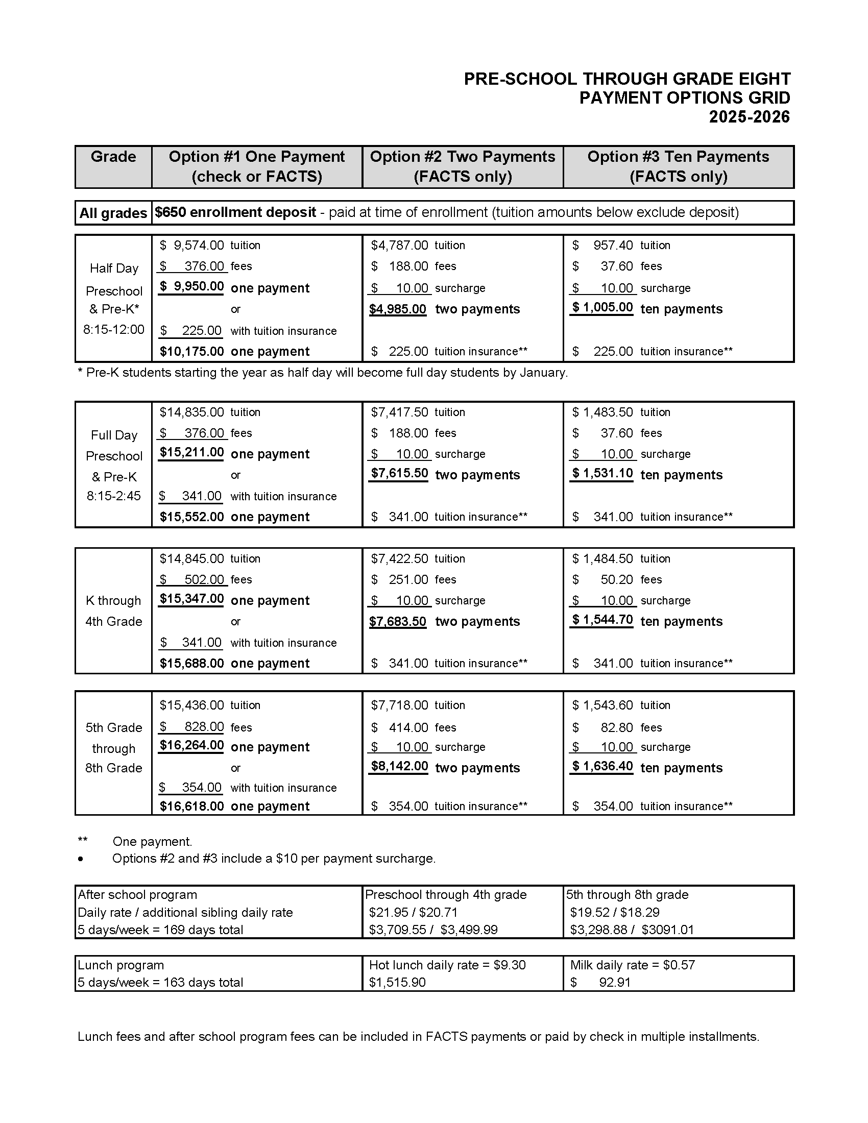 Enrollment deposit: an annual fee of $650 per student due each year at the time of enrollment for the upcoming school year (applied to tuition).